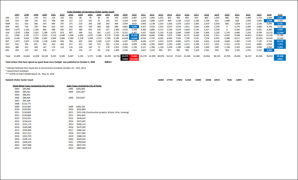 Forks Visitor Center Guest Book Stats Click on the image below to view a PDF document of Forks Visitor Center Guest Book Stats from 1997 thru current year. Susie Michels2025-12-07T10:10:24-08:00February 1st, 2024|Chamber News|0 Comments