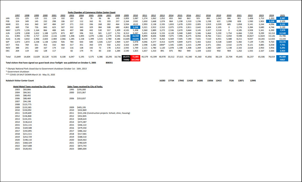 Forks Visitor Center Guest Book Stats Click on the image below to view a PDF document of Forks Visitor Center Guest Book Stats from 1997 thru current year. Susie Michels2026-01-04T08:56:18-08:00February 1st, 2024|Chamber News|0 Comments