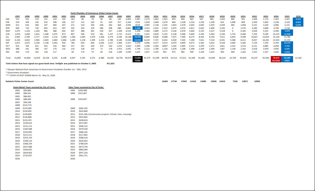 Click on the image below to view a PDF document of Forks Visitor Center Guest Book Stats from 1997 thru current year.